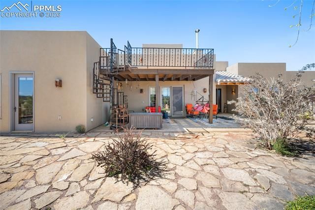 Experience true Santa Fe-style luxury on 75 breathtaking acres at 8200 Abbey Road. Built in 2012 with a vision of tranquility and peace, this 3-bedroom, 3-bathroom custom home blends architectural artistry, privacy, and panoramic views of the Wet Mountains and Greenhorn Mountains from the expansive upper deck. A long gravel driveway lined with piñon trees welcomes you in, while an artistic cedar fence complements the home’s authentic Santa Fe design. Inside, you’ll find heated concrete floors, 10-foot exterior doors, arched doorways, and expansive windows that fill the home with natural light. The kitchen features a massive custom wood island, walk-in pantry, and butler’s pantry—ideal for entertaining. The primary suite offers a private reading/sunroom and dual walk-in closets. This is more than a home—it’s an artist’s playground, a rancher’s dream, and a place for generations to gather. The land features natural landscaping, a rock garden, private shooting range, and endless possibilities. Improvements include a 40x40 barn, 800 sq ft shop, two sheds, oversized 3-car garage, and new septic system. Located just 15 minutes from Pueblo and Rye, offering convenient access to dining, golf, and amenities while maintaining privacy and serenity. If you’ve been dreaming of Santa Fe style in Colorado, this is a rare opportunity to own something truly special.